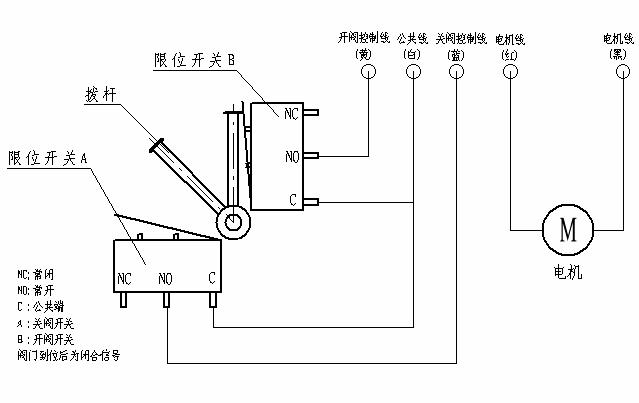 4)執(zhí)行機(jī)構(gòu)引出線中:黑色線為電機(jī)正極引出線,紅色線為電機(jī)負(fù)極引出線,黃色線為開(kāi)閥到位引出線,藍(lán)色線為關(guān)閥到位引出線,白色線為閥到位公共線。