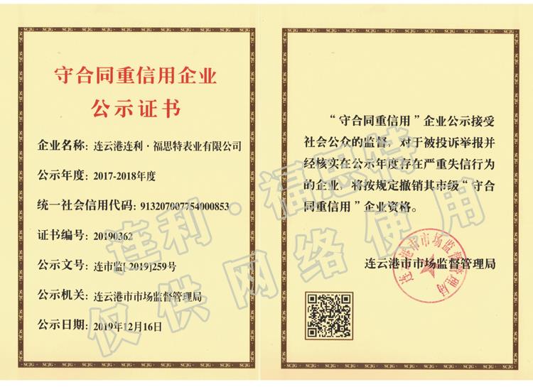 近期,連云港市市場監(jiān)督管理局公布了2017-2018年度連云港市“守合同重信用”企業(yè)名單,連云港連利·福思特表業(yè)有限公司名列其中,公司獲得“守合同重信用企業(yè)”榮譽,這是公司連續(xù)第三次獲得該榮譽。據(jù)悉,市級“守合同重信用”企業(yè)是由15個市級機關組成的市級“守合同重信用”企業(yè)評審委員會評審。