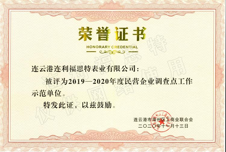 近日,連云港連利福思特表業(yè)有限公司榮獲“2019-2020年度民營企業(yè)調(diào)查點工作示范單位”稱號。